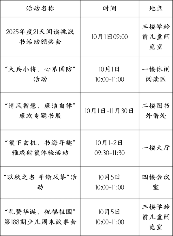为丰富读者的假期文化生活,我馆在节日期间将开展精彩的活动,欢迎前来参加!